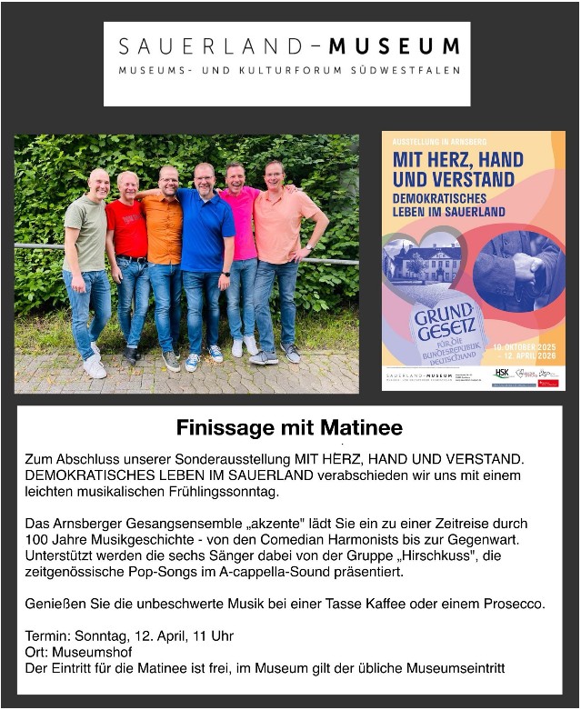 Auf Einladung des Arnsberger Gesangsensembles akzente kommen die A-cappella-Profis von MAYBEBOP auch 2026 wieder nach Arnsberg! Vier Typen. Vier Mikrofone. „Muss man mögen“.